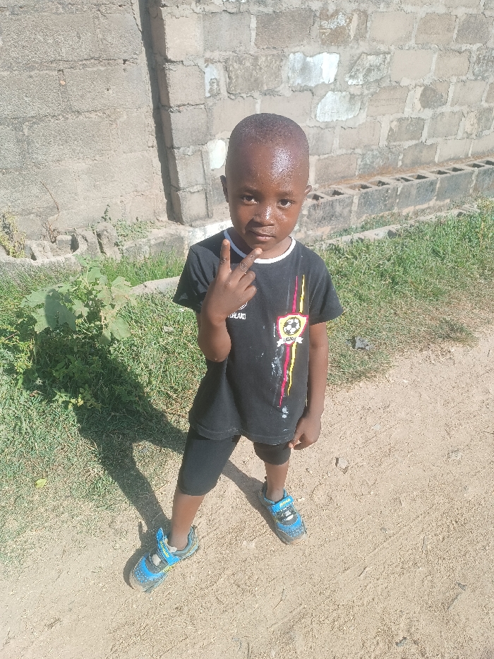 A young child with dark skin and a shaved head stands outdoors, facing the camera directly