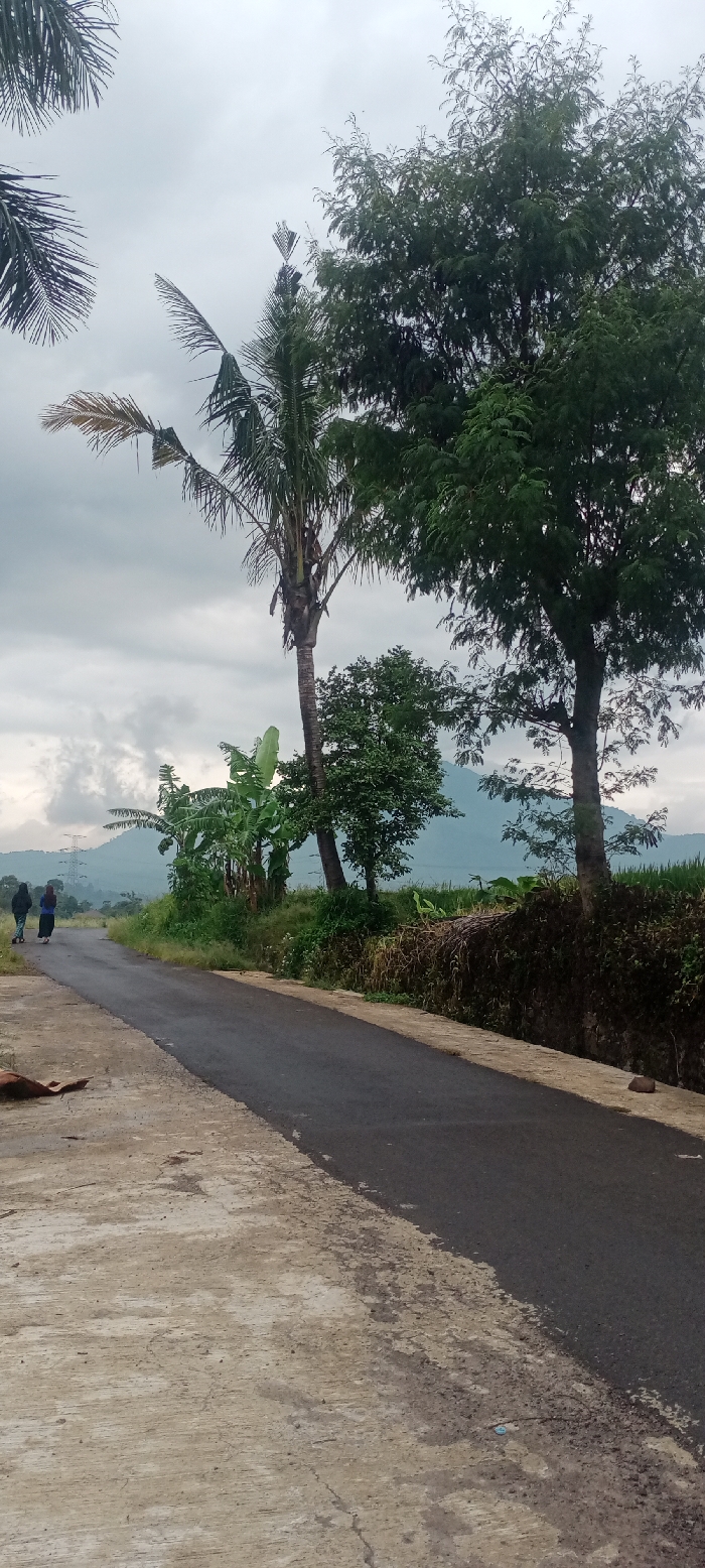 The image depicts an outdoor rural scene in Cimaung, Indonesia, under an overcast sky