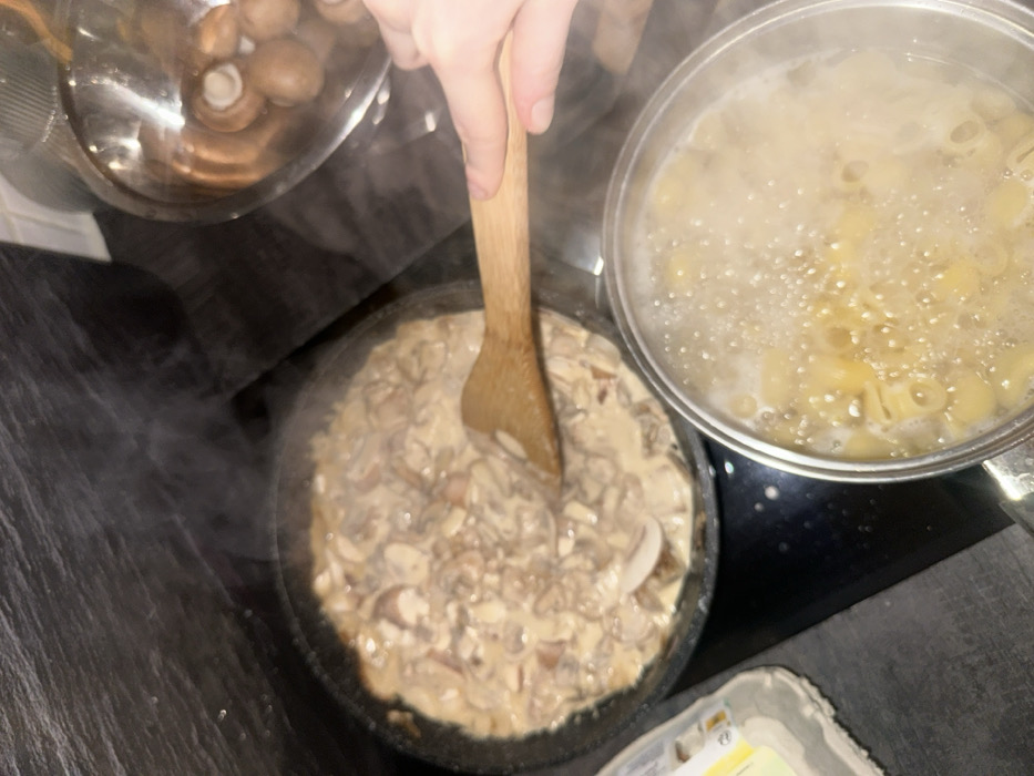 The scene depicts a domestic kitchen environment, understood to be located in Nanterre, France. The image is captured from an overhead perspective, focusing on a cooking surface. In the foreground, a silver-colored pot contains actively boiling water with light-colored pasta, likely macaroni or similar tubular shapes, visible within. Steam rises from the pot. To the left of the pot, on a dark, reflective cooktop, a black frying pan holds a creamy mixture of sliced mushrooms in a light-colored sauce, also emitting steam. A wooden spatula or spoon, with a light brown handle and a broader, flattened end, is positioned inside the frying pan, resting on the food. A human hand, appearing to be an adult's right hand with visible knuckles, grasps the handle of the wooden spoon, indicating an active stirring or holding motion. In the upper right background, a clear glass or plastic bowl, partially filled with water, contains several whole brown mushrooms. The surface supporting these items is dark, possibly a black or dark grey countertop, reflecting some ambient light. A textured, dark grey or black wall panel is visible behind the cooking area. To the far left, a portion of a white, possibly cardboard, container with some yellow markings is visible on the countertop.