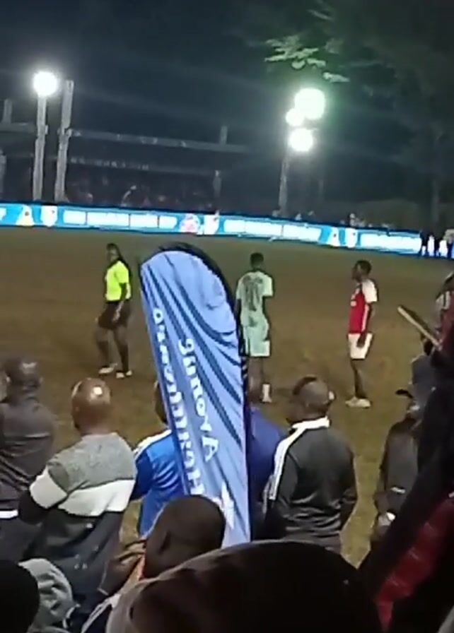 soccer match at night. Several players are visible on the field, wearing jerseys in white and red, and white and green. A referee is also visible, wearing a bright green shirt. A banner is located near the sideline. Spectators are in the foreground, watching the game. The field is illuminated by stadium lights.