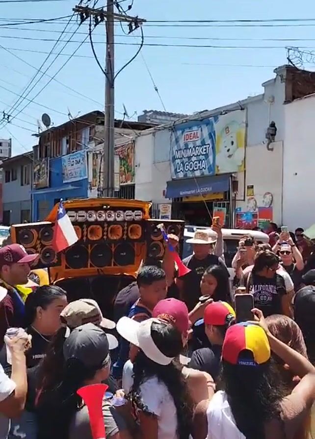 A crowd of people of various ages and ethnicities dances around a yellow vehicle with an array of speakers in its rear. Many people are holding up cell phones to record the scene. Several are wearing hats with the colors of the Venezuelan flag, and one person is holding a Chilean flag. The dance appears to be taking place in a residential neighborhood with a minimarket visible in the background, under a clear, sunny sky. Power lines crisscross overhead.