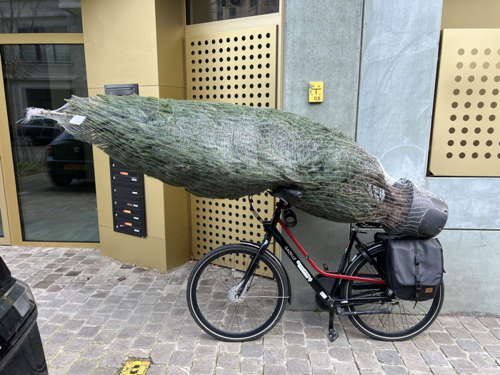 - "The scene captures a street-level view in Antwerp, Belgium, featuring a bicycle laden with a net-wrapped Christmas tree, positioned on a cobblestone pavement adjacent to a modern building" by FM-AuMyu1, licensed under CC BY 4.0