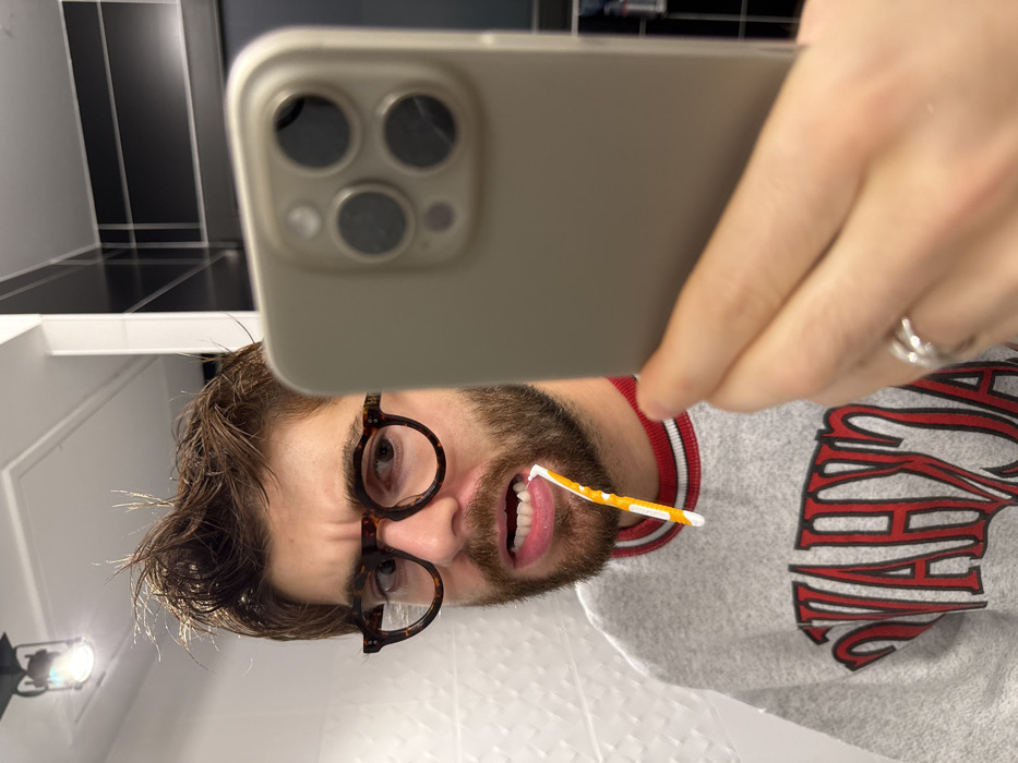 An adult male is depicted in a mirror selfie taken within what appears to be a bathroom in Chambœuf, France. The subject has dark, disheveled hair, a full beard, and is wearing round, tortoise-shell framed glasses. His eyes are wide, eyebrows furrowed, and mouth slightly open, revealing an orange and white interdental brush positioned between his lower front teeth. He is wearing a grey sweatshirt with a red and white striped collar and a red graphic on the chest. His right hand holds a light-colored smartphone, visible in the foreground, with its triple-lens camera array partially cracked on one lens. A silver ring with two bands is on the ring finger of his right hand. The reflected background includes white textured wall tiles on the left, a black-framed light fixture on the ceiling, and black and white striped wall elements on the right.