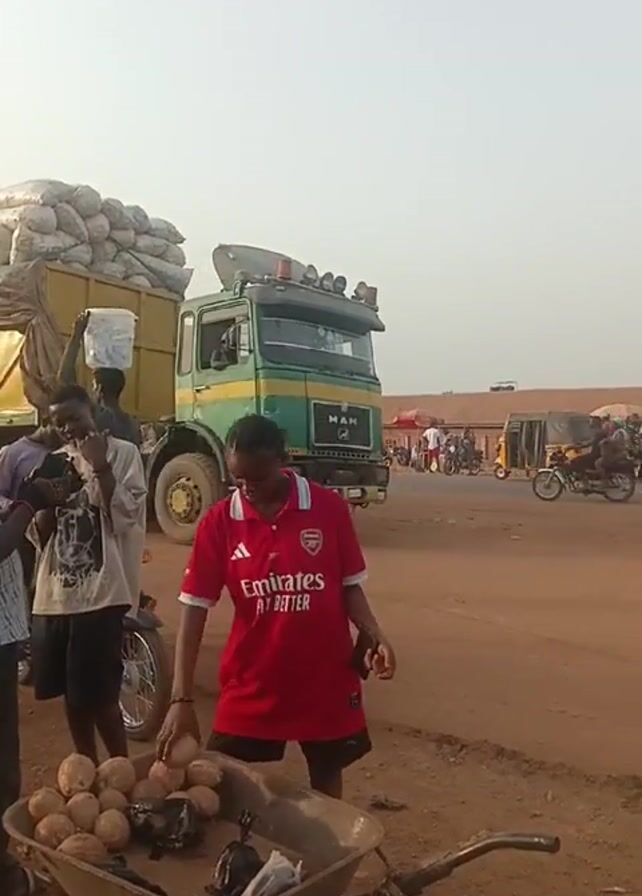 street scene in an African town or village. The ground is red dirt. A large green and yellow truck filled with bags drives by. In the foreground, a person wearing an Arsenal soccer jersey stands in front of a wheelbarrow filled with round brown objects, possibly potatoes or yams. Other people are visible in the background, some on motorcycles. A person wearing a white bag on their head is next to the truck. The sky is overcast and hazy.