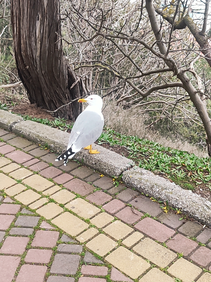 An adult seagull stands on a light grey concrete curb in Utios, Ukraine. The bird features a white head and underparts, light grey wings and back, bright yellow legs and webbed feet, and a yellow beak with a prominent red spot on the lower mandible. Its tail is white with distinct black spots on the outer feathers. The seagull faces slightly left, with its head turned to the left. The curb separates a paved pathway in the foreground from a vegetated slope in the background. The path is composed of interlocking rectangular pavers in alternating tan and reddish-brown hues, with green grass growing in the interstices. Behind the curb, a large, dark brown, deeply furrowed tree trunk is visible on the left, while the rest of the background consists of numerous bare, leafless tree branches and green ground cover on a downward-sloping terrain.