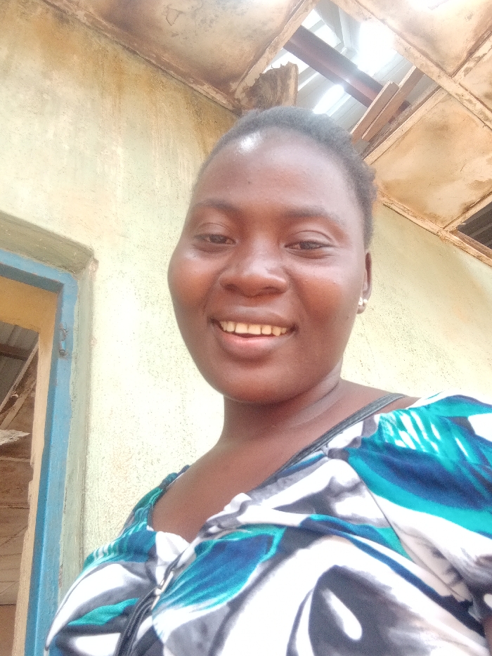 A mid-shot photograph features an adult female subject centrally positioned, smiling directly at the camera. The subject has dark skin, short dark hair, and is wearing a multi-patterned top in shades of blue, teal, white, and black. A small, light-colored stud earring is visible in her left earlobe. The background consists of a light-colored, possibly beige or pale yellow, wall exhibiting discoloration and wear. To the subject's left, a faded light blue doorframe is visible, revealing rough interior construction elements beyond it. Above and to the subject's right, a damaged or incomplete ceiling structure is present, exposing wooden beams and corrugated metal roofing material. The ceiling panels are light-colored and show signs of deterioration and missing sections. This scene is located in the city of Akwanga, Nigeria.
