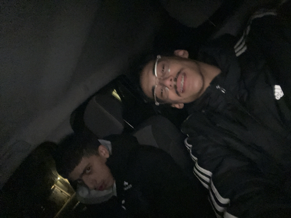 Two young men in dark Adidas athletic wear pose inside a vehicle at night. The man on the right wears glasses and smiles, while the man on the left has a serious expression. The car interior is dark, with glimpses of seats and windows. The lighting is dim, making details difficult to discern.