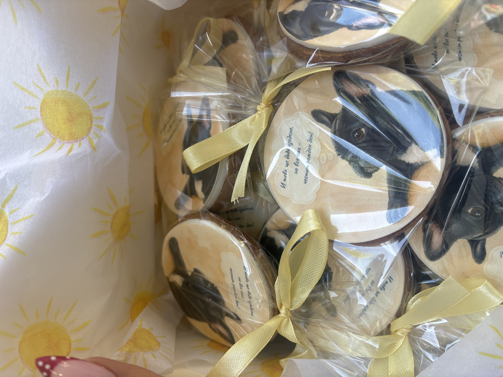 box of round cookies, each decorated with a picture of a French Bulldog dog, wrapped in clear cellophane and tied with a pale yellow ribbon. The cookies are arranged inside a white box lined with tissue paper printed with a yellow sun design. Each cookie also contains written Bulgarian text "И това ще бъде изядено, но все пак - честит рожден ден!", which translates to "And this will be eaten, but still - happy birthday!". The image was likely taken in Dupnitsa, Bulgaria, as that is the language used.