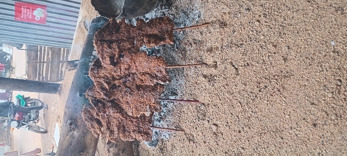 Skewered, grilled meat sits on a charcoal brazier, alongside a sandy area. The meat is brownish-red. Wooden skewers hold the meat. The brazier is dark grey. In the background, there's a motorbike and corrugated metal structure, with a red poster. The scene has a rustic, street-food vibe.