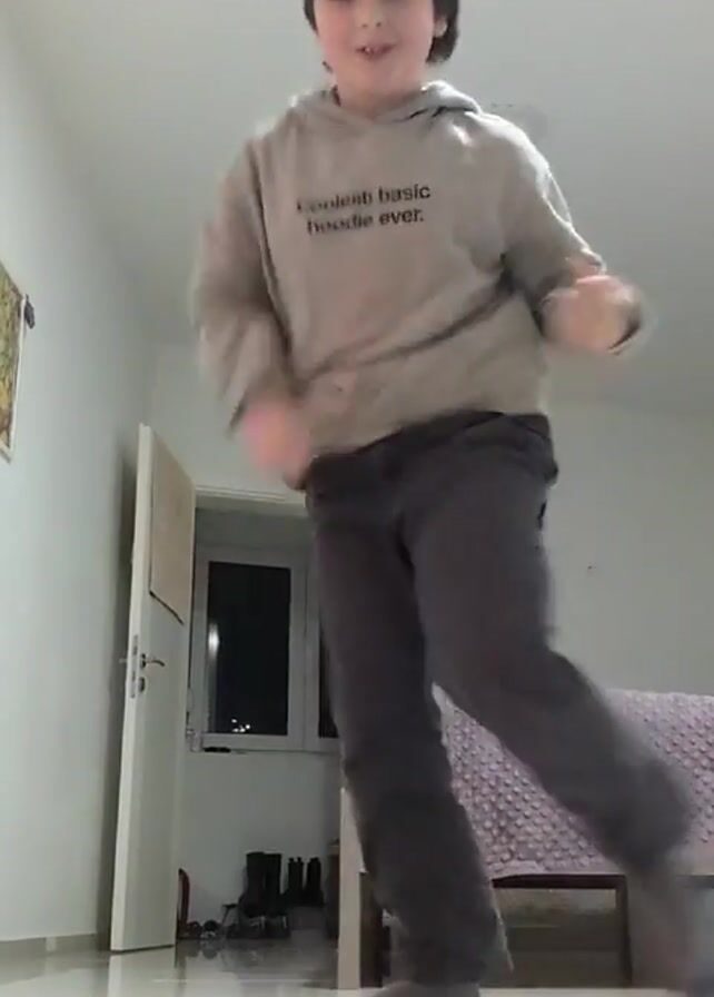 A young boy is dancing in a bedroom. He is wearing a grey hoodie with the words "Coolest basic hoodie ever." written on it, along with grey pants and grey socks. He moves with his arms out, shifting his weight from foot to foot. The room has white walls, a light-colored tiled floor, and a bed with a purple patterned spread. There is a door visible in the background, and a painting on the wall.