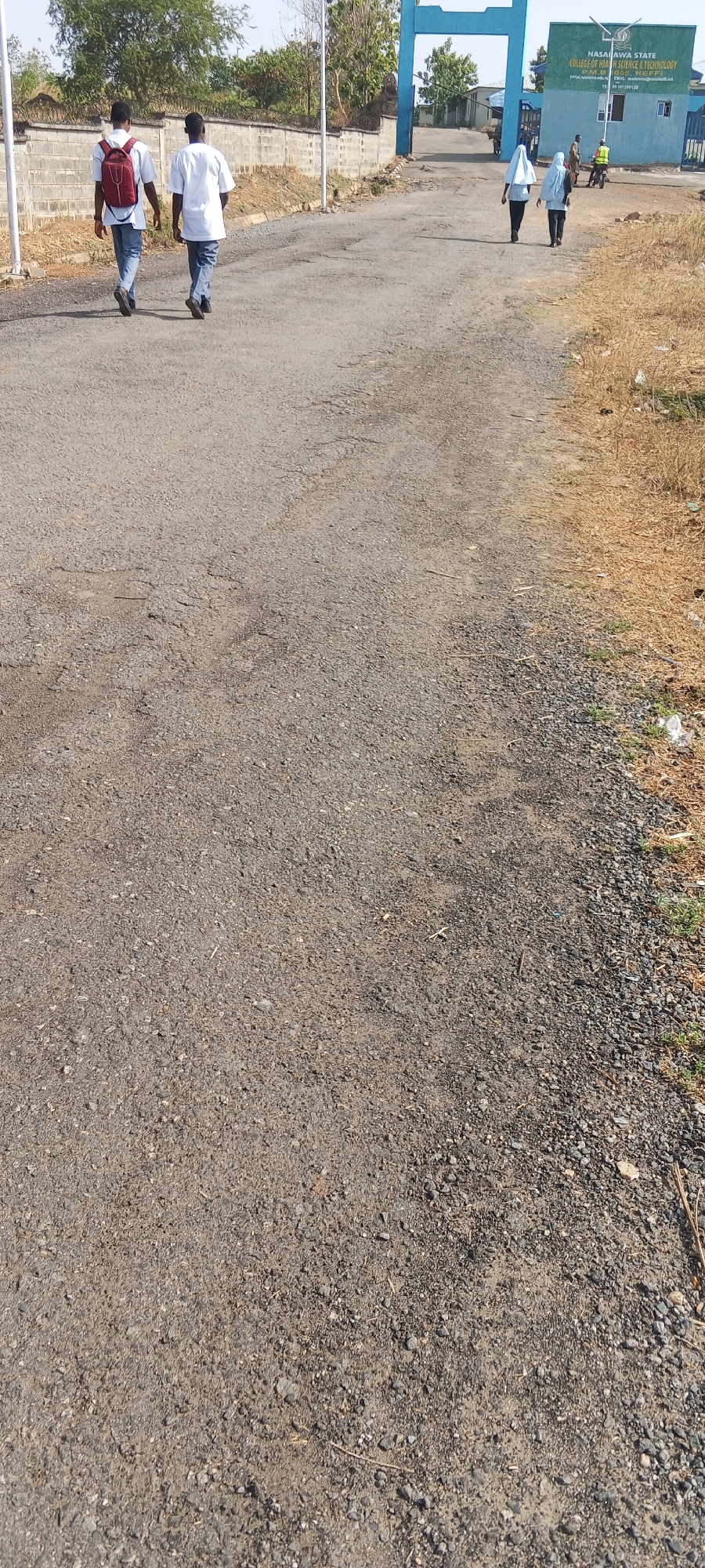 The image depicts a paved road leading to the entrance of Nasarawa State College of Health Science & Technology in Keffi, Nigeria