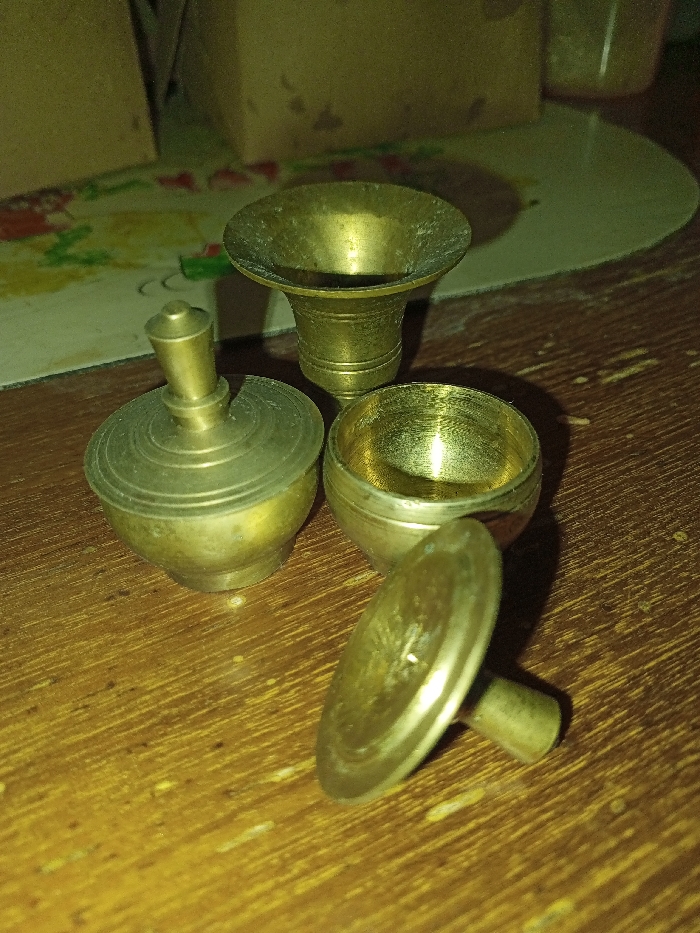 The scene is set indoors in Longmiang, Laos, on a wooden surface displaying distinct grain patterns and signs of wear. Three small, aged metallic objects, appearing to be brass or bronze due to their color and tarnish, are arranged closely together. The object on the left is a small, lidded vessel with a rounded body and a pointed finial on its slightly-askew lid. To its upper right, a trumpet-shaped vessel stands upright, featuring a flared rim and a narrower base. Directly below and to the right of the trumpet-shaped vessel, an open, small, spherical bowl rests. Adjacent to this open bowl, on the lower right, lies a separate disc-shaped lid with a cylindrical stem or handle, positioned on its side. All metallic items exhibit visible tarnish and surface irregularities. The background is blurred, revealing a light-colored surface with a faint floral or patterned design behind the objects, and a rectangular, light-brown object further back on the left. Illumination appears to be from an artificial light source, casting subtle shadows. There are no people or discernible actions.