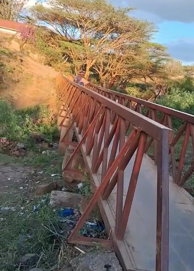 A person on a motorbike transports two passengers across a bridge made of metal. The motorbike is black and has a cardboard box on the front. The first passenger wears a gray shirt, a purple baseball cap, and glasses. The second passenger sits behind the driver and has a blue shirt on and a backpack. The bridge is composed of metal beams that have been painted red. The bridge spans a dry riverbed with some vegetation on either side of the riverbed. There is trash among the rocks and plants along the riverbed. Behind the bridge is a brown hillside with some trees. The sky is blue with white and gray clouds.