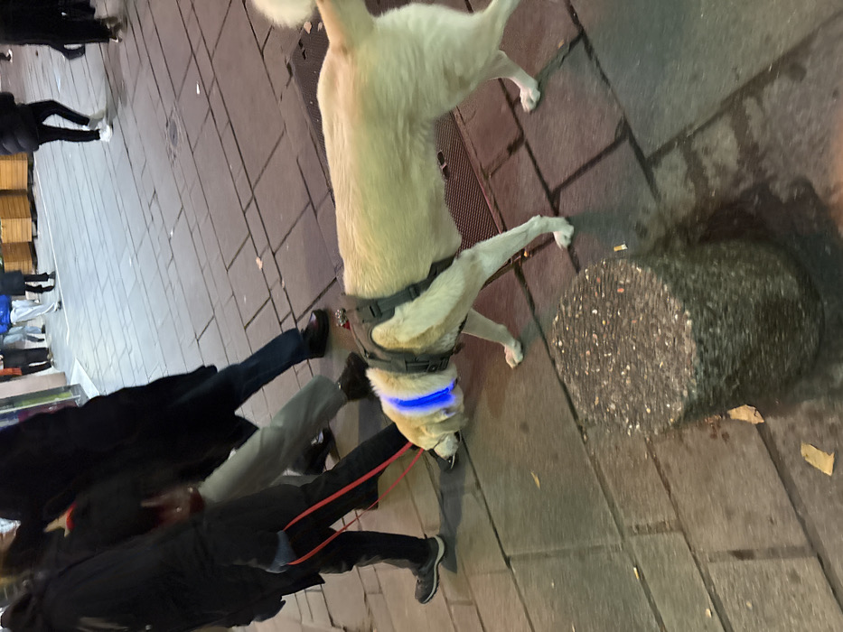 The scene depicts a paved pedestrian street in Strasbourg, France, under artificial nighttime illumination. A light-colored dog, wearing a blue glowing collar and a grey harness, is positioned in the foreground, walking towards the right with its head oriented downwards. A red leash extends from the dog's harness towards a partially visible individual on the left, whose lower legs are clad in black trousers and black sneakers. Two additional individuals are partially visible behind the leashed person, also walking towards the right; one wears light grey trousers and dark shoes, and the other wears dark trousers and dark shoes. The ground is paved with rectangular stone slabs. A dark, rough-textured, cylindrical bollard is situated in the lower-middle foreground. Scattered debris, including leaves and cigarette butts, are visible on the pavement. A dark metal grate is present on the pavement to the right of the dog.