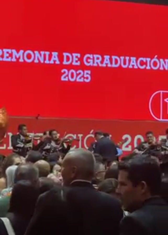 crowd of people at a graduation ceremony. The screen behind them says "CEREMONIA DE GRADUACIÓN 2025." A mariachi band is performing on stage. A man in a suit is shaking hands with someone. Many people in the crowd are dressed in suits.