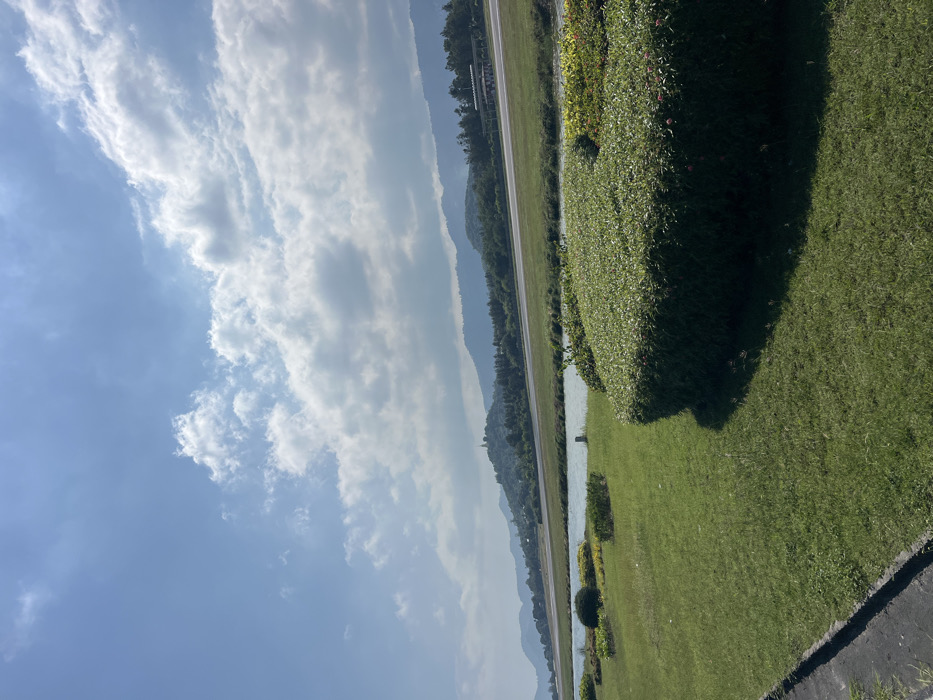 A landscape shot presents a vibrant scene. A clear blue sky with scattered clouds dominates the left, while mountains fade into the distance. Lush greenery, including grass and bushes, occupies the right foreground. A narrow road runs along the base of the mountains. A waterway separates the road from the greenery. The angle of the shot is slightly askew, causing a tilted perspective of the scene.
