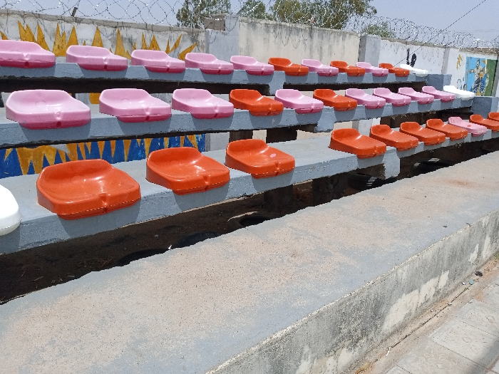 The scene is a set of concrete bleachers in Yola, Nigeria, located at latitude: 9.198, longitude: 12.491. There are 24 seats, 11 orange and 13 pink, arranged in three rows. They are set in concrete on a terraced slope facing a wall with blue and yellow geometric shapes painted on it. Behind the bleachers is a chain link fence and a small building. The scene is empty except for the seats. The weather appears sunny. The image captures a detail of the environment in Yola, Nigeria.