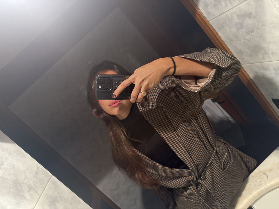 A female subject, reflected in a mirror, is depicted taking a selfie with a black smartphone held in her right hand. Her long, dark brown hair is visible, and she wears pink lipstick. Her right hand displays brown nail polish, a gold-toned ring on the index finger, and another on the ring finger. A black band is present on her left wrist. She wears a black top under a brown and black micro-patterned blazer, which features a gathered waist with a single button closure and rolled-up cuffs revealing a light-colored lining. The reflection in the mirror reveals light-toned rectangular wall tiles and a portion of a white sink basin in the lower left, indicating an indoor bathroom or washroom environment. No identifiable landmarks or features within the image specify the location as Naples, Italy, or any particular city.