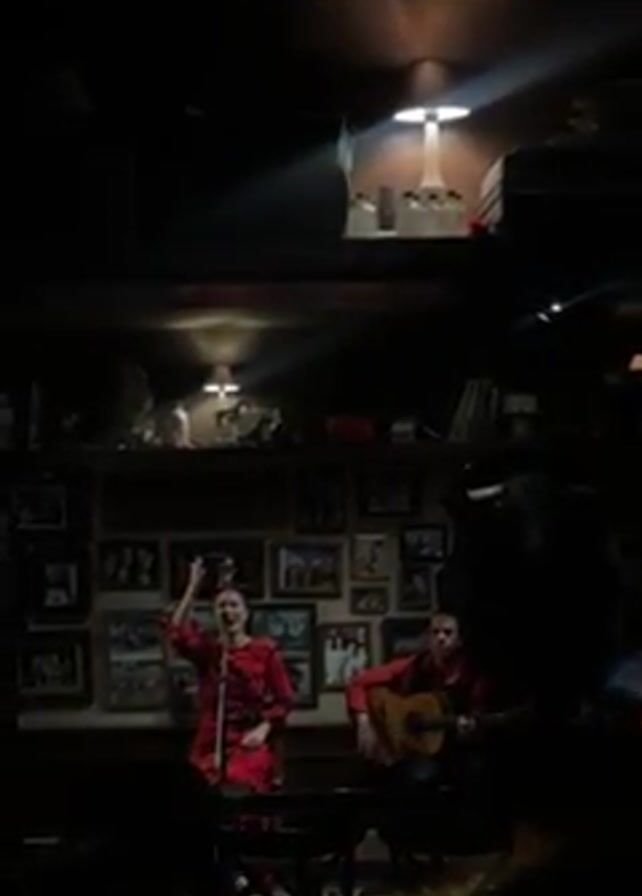 A video shows a musical performance in a dimly lit venue. A woman in a red patterned outfit is singing into a microphone, gesturing with her hands. To her right, a man is playing an acoustic guitar. They are on a small stage in front of an audience. Behind them is a wall lined with framed pictures and shelves with various objects, illuminated by small lamps. A few members of the audience are visible in the foreground, one with a lit candle on their table.