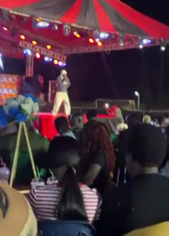 A crowd is watching a performer on a stage under a large red and black tent structure. The stage is lit with bright spotlights and some decoration. Some of the audience members are seated at tables, while others are standing, some of whom are recording with their phones. A man in a white shirt moves through the seated audience. The scene appears to be at night, at an outdoor event.