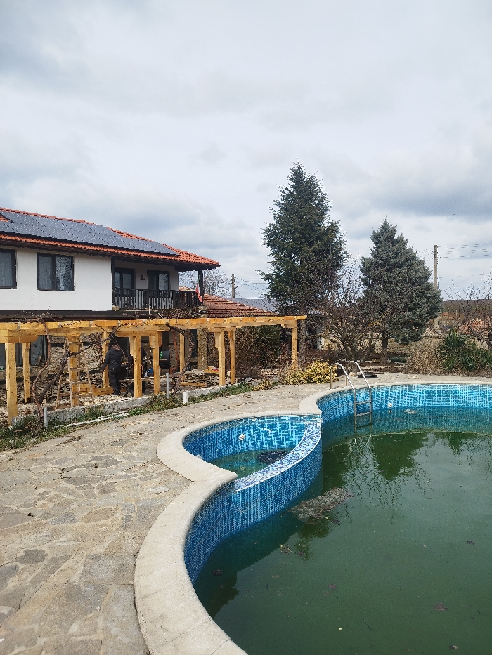 The image captures an exterior scene at a residential property in Levski, Bulgaria, under an overcast sky. A two-story house with a white facade and a red tiled roof, partially covered by dark solar panels, stands on the left. The upper floor features a balcony with a dark railing. Extending from the ground level of the house is a partially constructed wooden pergola, composed of light-colored timber posts and beams, with vines growing on it. One individual, dressed in dark clothing, is observed within the pergola structure, engaged in an unspecified activity consistent with construction or maintenance work. In the foreground and midground, an irregularly shaped swimming pool, lined with blue mosaic tiles, dominates the scene. The pool contains stagnant, dark green water, indicating disuse or neglect, with a metal ladder visible and partially submerged at its edge. The area immediately surrounding the pool and leading towards the house is paved with irregular flagstones. Behind the pool and to the right of the house, several evergreen trees of varying heights and bare deciduous trees are visible. The distant background consists of sparse vegetation and indistinct structures. The lighting is diffused, consistent with an overcast day.