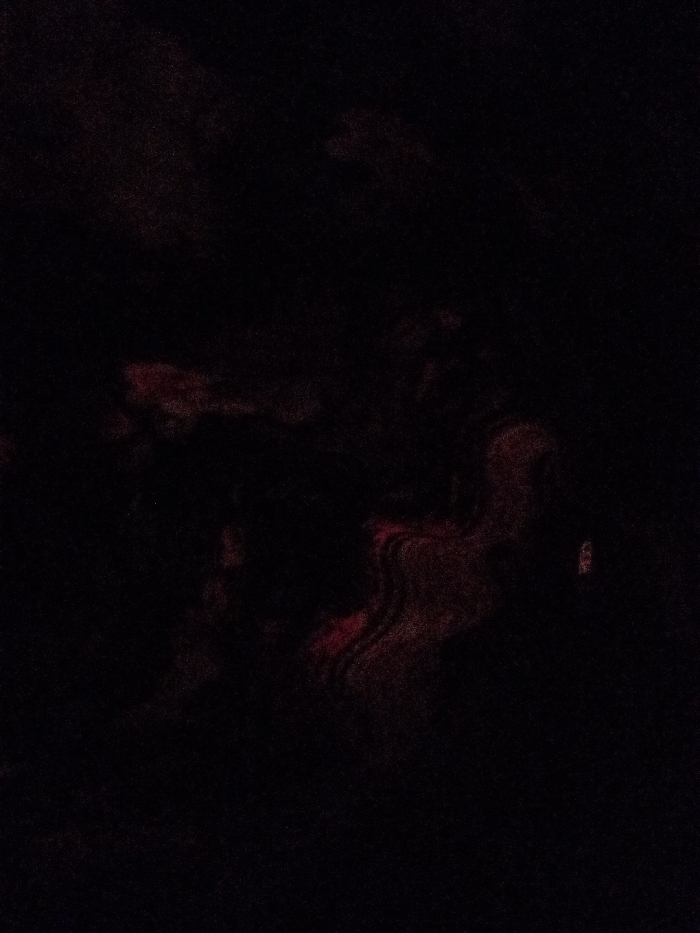 The image displays a scene characterized by profound darkness, rendering most specific details indiscernible. The perceived environment is located in the city of Unknown, Unknown. The majority of the frame is black, indicating extremely low light conditions. Irregular, amorphous patches of faint reddish-brown and dark red coloration are discernible, primarily in the central and lower portions of the image. These colored areas exhibit subtle variations in tone and texture, including some indistinct wavy patterns. No identifiable individuals, subjects, objects, actions, or interactions are evident within the scene.