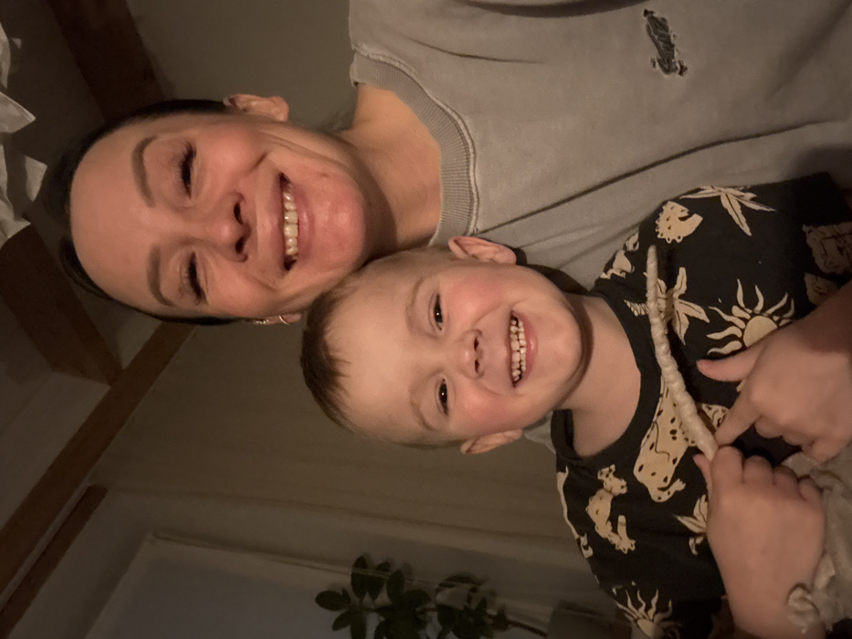 The scene is an indoor domestic environment located in the city of Chaikovsky, Russia. Two individuals, an adult female and a young male child, are depicted from the upper torso upwards, both smiling and looking directly at the camera. The adult female, positioned on the right, has dark hair pulled back, visible eyelashes, and wears a light grey long-sleeved top with a faded dark logo on the left chest area. A small silver hoop earring is visible on her left ear. The young male child, positioned slightly in front and to the left of the female, has light brown hair, rosy cheeks, and wears a dark t-shirt featuring a light-colored pattern resembling animals and suns. The child holds a thin, pale, twisted, organic-looking object in both hands, with his right index finger extended towards it. In the blurred background to the left, a potted plant with dark green leaves is visible next to a window covered by a light-colored curtain. Wooden ceiling beams are present in the upper left portion of the frame, and some white crumpled material is visible on the ceiling in the upper right. The lighting is soft and ambient.