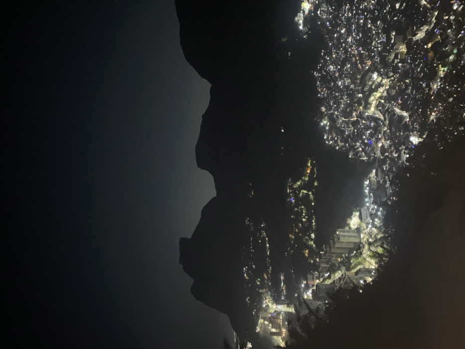 A dark, mountainous landscape at night. One side has a solid dark mass, likely a mountain range silhouetted against the night sky. The other side features a densely populated area with numerous lights, possibly a city or town built on steep terrain. The lights are clustered, suggesting a close proximity of buildings. A section connecting the mountain and the town shows sparse lights along a hillside.