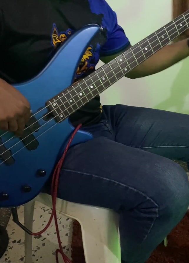 - "A man is seated on a white plastic stool playing an electric bass guitar" by FM-kBA5V2, licensed under CC BY 4.0
