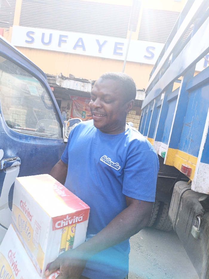 In Fagge C, Nigeria, a male subject of African descent is depicted outdoors during daytime. He is wearing a blue short-sleeved t-shirt with a "Hollandia" logo on the left chest. The subject is holding and carrying two stacked white cardboard boxes branded "Chivita," containing what appears to be pineapple-flavored juice products. He is smiling and looking slightly to his left. Behind him, to the left, is the partial door and window of a blue vehicle, possibly a van or truck cab. To his right, a large blue truck with yellow accents and a visible taillight is partially visible, showing its tires and a padlocked fuel tank. In the background, a building with a large blue sign reading "SUFAYE S" is visible, along with another structure exhibiting various posters.