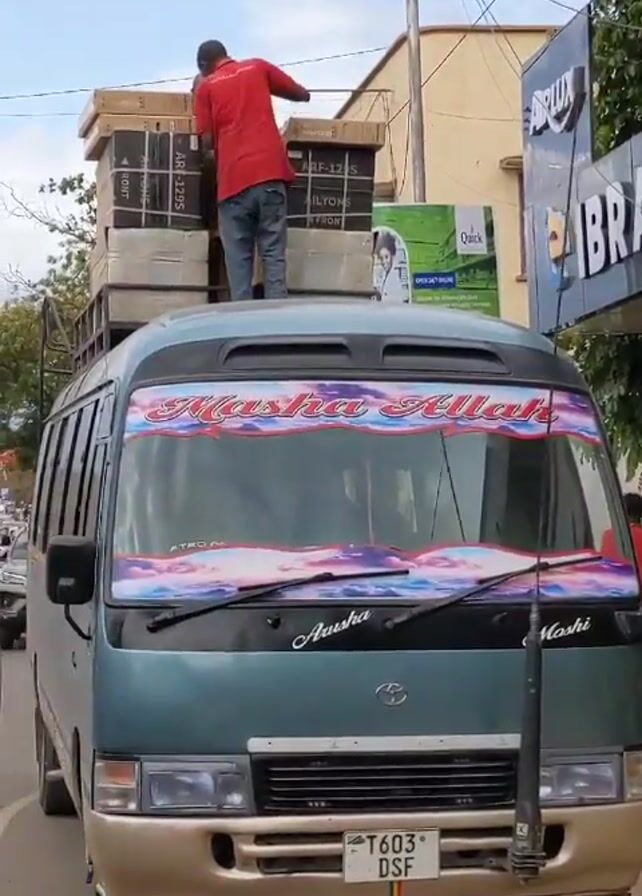 man standing on the roof of a blue and gold minibus, securing a load of large boxes. The boxes are stacked high and strapped down. The minibus has the phrase "Masha Allah" written across the top of the windshield. There is a Tanzanian license plate visible. People are walking around nearby. Signs for paint brands are visible in the background. The scene appears to be on a city street during the daytime.