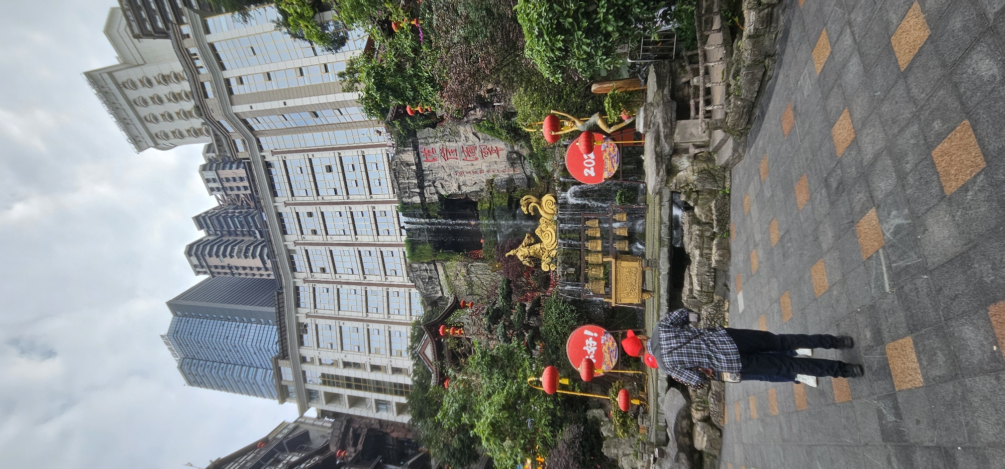 - "An outdoor, eye-level, slightly upward-angled view depicts a public area with an artificial waterfall and elaborate decorations set against a backdrop of urban high-rise buildings in Yuzhong District, China, under an overcast sky" by FM-UqsN33, licensed under CC BY 4.0