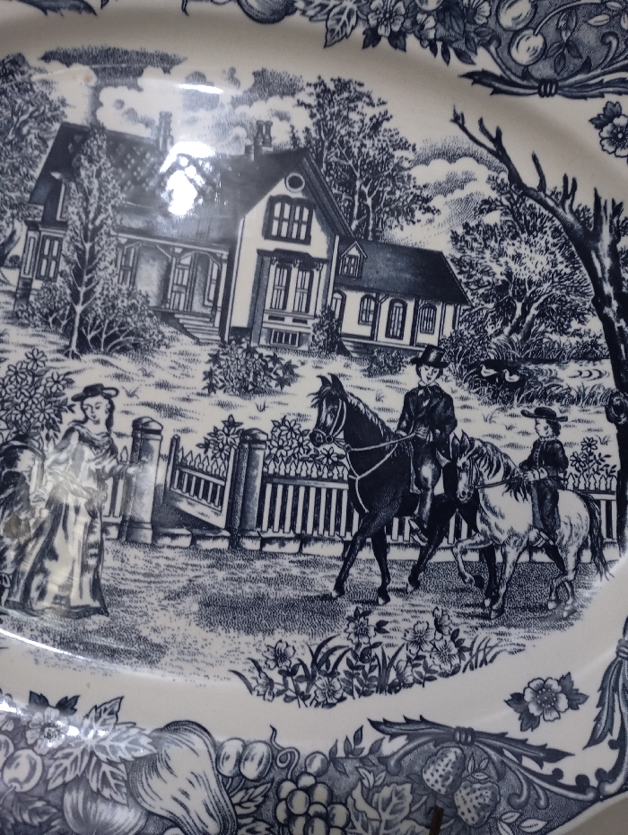 - "The image is a photograph of a glossy, blue and white transferware ceramic plate, featuring a detailed rural landscape scene" by FM-qjUs52, licensed under CC BY 4.0