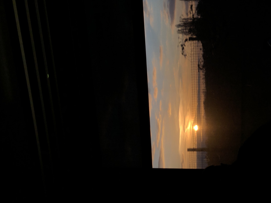 The image captures a sunset over a rural landscape in Mundolsheim, France, viewed from an interior location