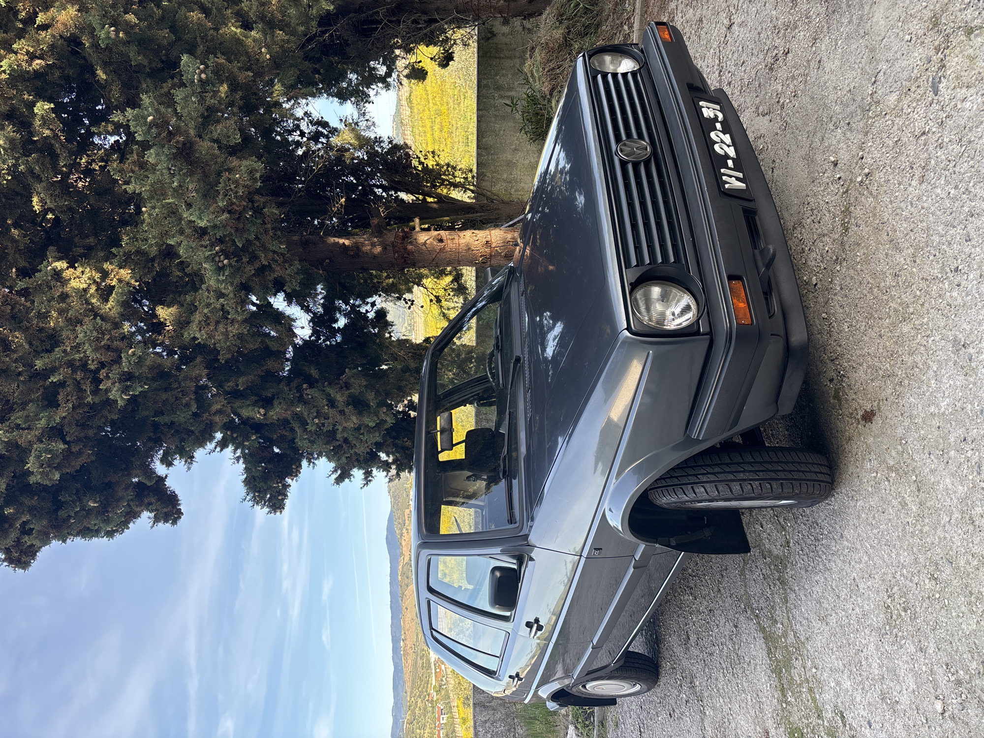 gray Volkswagen Golf Cabriolet parked on a paved surface next to a large tree. The car has a black front grille and a license plate that reads "VI-22-31". In the background, there are fields and hills under a blue sky with light clouds. The location is not specified, and there is no information to determine if it is a city or rural area. No people are visible in the image.
