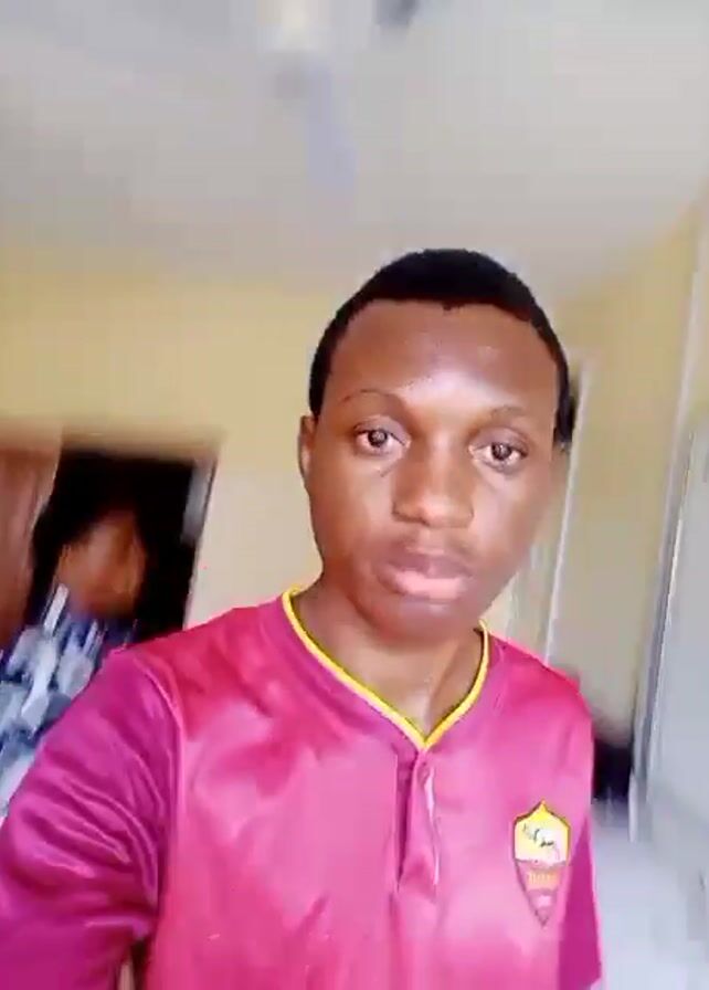 man in a red and yellow soccer jersey holding a camera and filming himself. He is in an office space. Behind him are several other men dressed in different outfits. The man in the soccer jersey turns the camera around to show the other men in the room. One of the men is wearing a black and white patterned shirt, another is wearing a green outfit, and another is wearing a black shirt. The room has desks, chairs, and computers. There is a ceiling fan visible in the background. The people appear to be talking and interacting with each other.