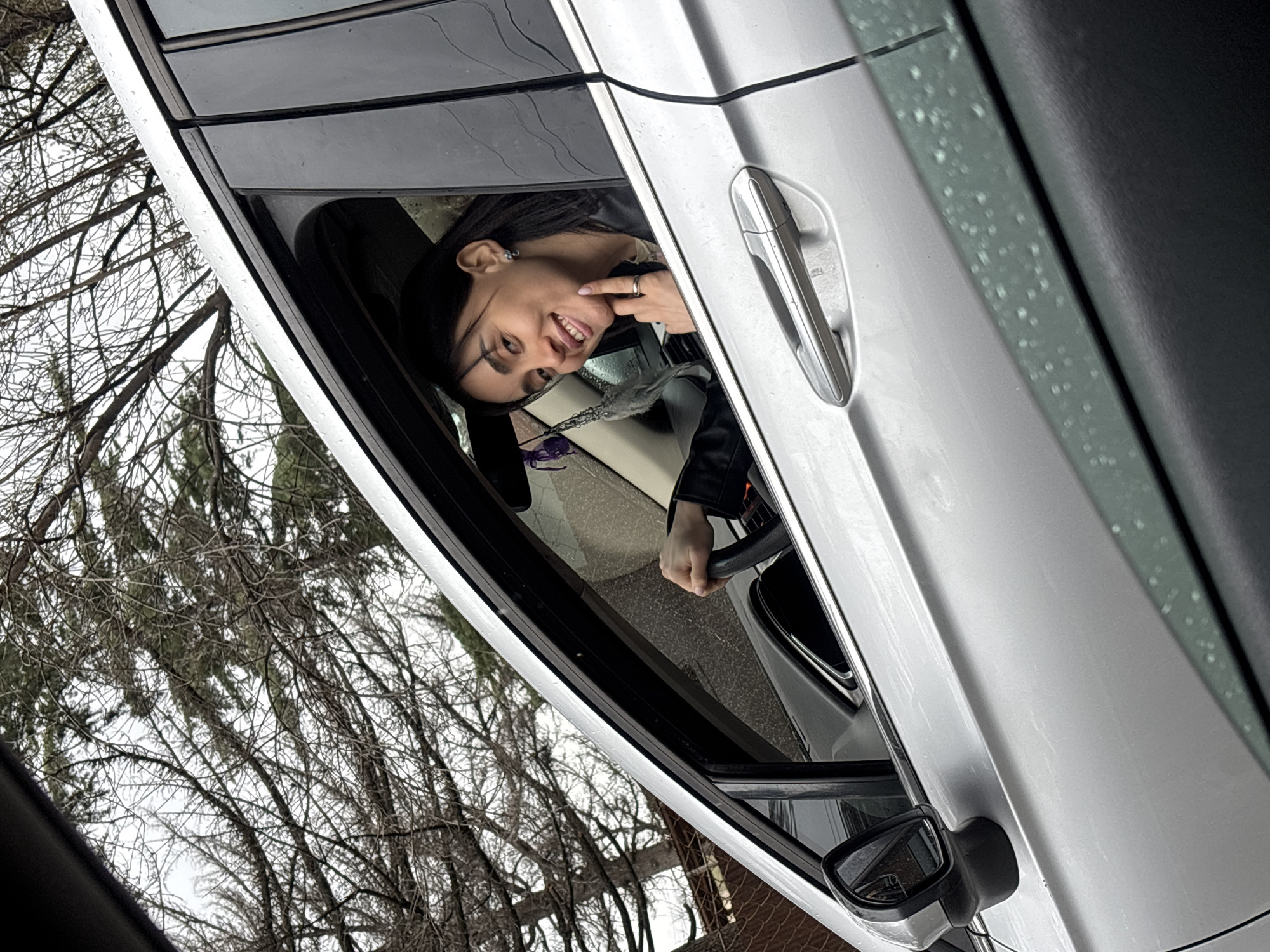 A female individual is depicted in the driver's seat of a silver-colored vehicle, located in Tbilisi, Georgia. She is seen through the fully open driver's side window, smiling and looking directly at the camera. Her dark hair is parted on the side, and she wears stud earrings. Her right hand grips the steering wheel, while her left hand, adorned with a silver-toned ring on the ring finger, has its index finger touching her chin. She is wearing a dark jacket over a lighter garment. A fuzzy dark grey ornament with purple ribbon hangs inside the vehicle, visible near the rearview mirror area. The exterior of the silver car shows small droplets of moisture. The background consists primarily of a dense network of bare tree branches against an overcast, light grey sky, with some green foliage visible amongst the branches. A section of a light brown fence is present in the lower left background, behind the trees.
