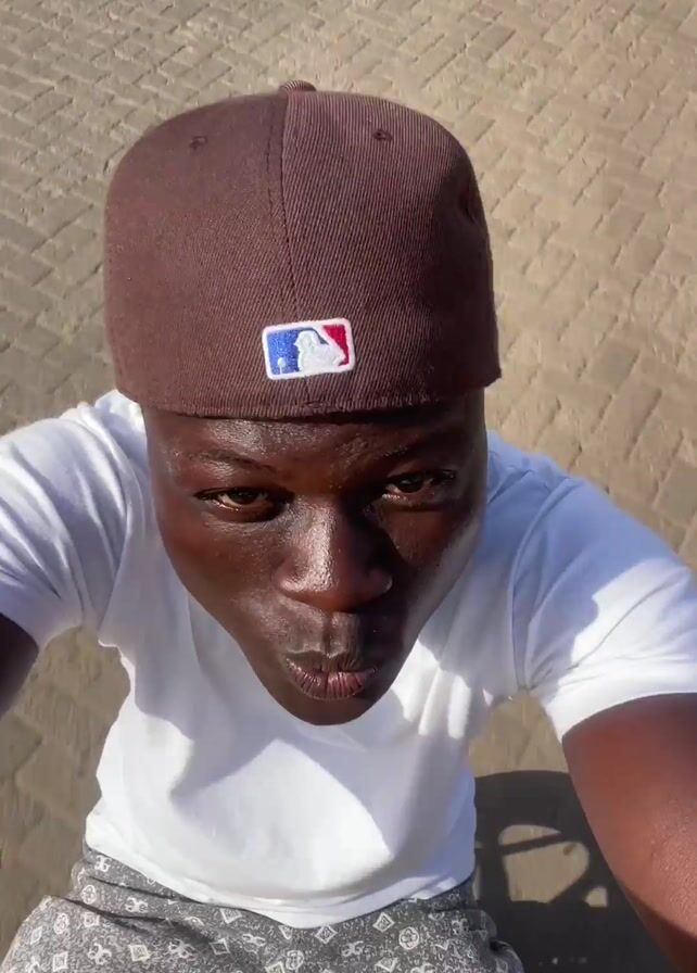 A dark-skinned male wearing a brown baseball cap with a white t-shirt and patterned shorts looks directly at the camera while holding the device taking the video