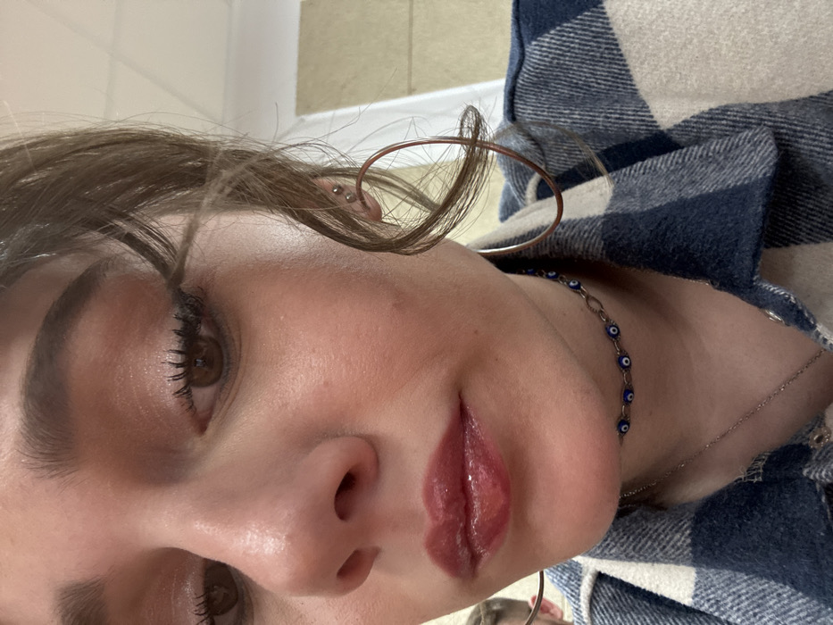 The image presents a close-up, upward-angled view of an individual, likely female, captured from approximately the chest up. The subject's face dominates the frame, featuring brown eyes with visible mascara, well-defined eyebrows, and a rosy complexion. The lips are painted with a glossy, reddish-pink product. Wavy, brown-toned hair frames the face, with some strands obscuring parts of the right eye and ear (viewer's left). The subject wears several pieces of jewelry: two small silver stud earrings are visible in the left earlobe, accompanied by a large, thin, oval-shaped hoop earring in the same ear. Around the neck, a silver chain choker is worn, adorned with multiple small blue "evil eye" beads. A finer, longer silver chain necklace is also visible lower on the chest. The subject is dressed in a blue and off-white plaid flannel shirt. To the lower left of the frame, a blurry partial head of another individual is faintly discernible. The background is out of focus, depicting a light-colored, possibly off-white or beige wall or partition, indicative of an indoor environment such as a classroom, office, or public building. While the specific location within Sofia, Bulgaria, cannot be definitively identified from the visual content, the scene is situated indoors within a generic building setting in the city of Sofia. No distinct actions or direct interactions are visible, other than the subject posing for the photograph.
