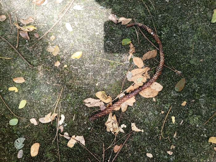 - "A brown braided belt is curled amongst dry leaves on a concrete surface covered with patches of moss" by FM-U09Jo1, licensed under CC BY 4.0