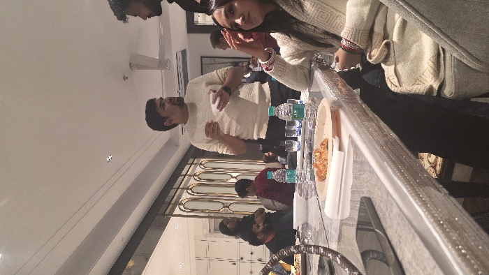 People are gathered around a long table in what appears to be a restaurant or dining room. There are at least seven individuals visible, some standing and some seated. Plates of food, including pizza, and bottles of water are on the table. The room has neutral-toned walls and decorative gold trim. The lighting is bright.
