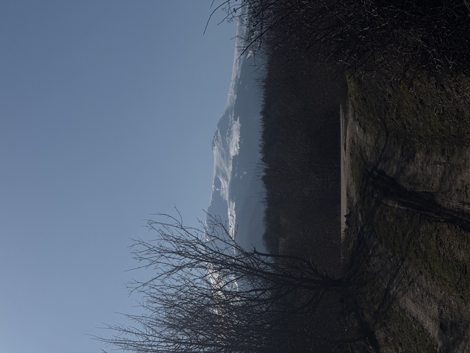 The image presents a rural landscape in Bistritsa, Bulgaria, under a clear, bright blue sky. In the foreground, a dirt track, approximately 2 meters wide, with visible tire impressions, leads from the lower center of the frame towards the mid-ground. The track is flanked by sparse dry grass and dirt. To the left of the track, two prominent leafless deciduous trees cast long shadows towards the right. To the right of the track, dense, dark, leafless shrubs form a natural boundary. In the mid-ground, a thick, dark line of deciduous trees and shrubs forms a horizontal barrier. Beyond this, a prominent mountain range with extensive snow cover on its peaks dominates the background. The snow-capped mountains extend across the entire width of the frame, beneath the clear sky. No individuals, animals, or active interactions are observed within the scene. The lighting conditions suggest direct sunlight, indicating a clear day in late winter or early spring.
