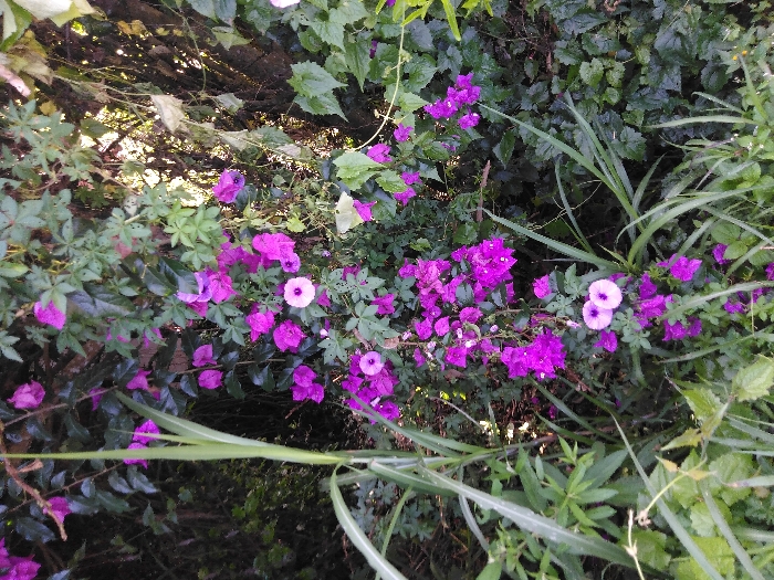 The image displays an overgrown outdoor scene in Ban Naduan, Laos, dominated by dense vegetation. A prominent cluster of vibrant purple bougainvillea flowers is visible, intermingled with several pale pink morning glory-like flowers, each featuring a white center. This flowering growth is surrounded by and intertwined with various green foliage, including broad, dark green leaves forming a dense background and several tall, slender, light green grass-like plants in the left foreground. The scene presents a natural, uncultivated environment under natural daylight. No individuals, man-made objects, or specific actions are depicted.