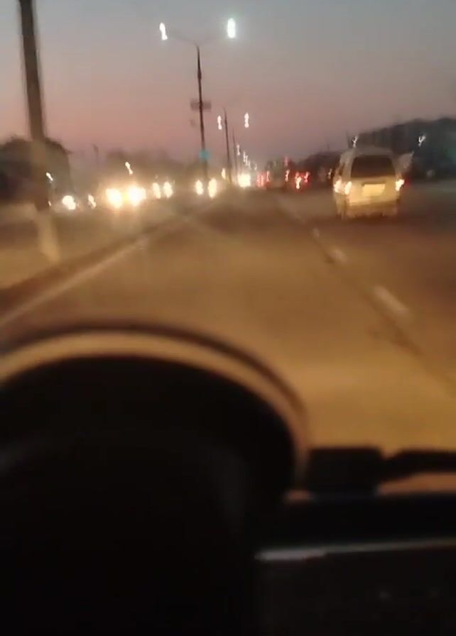 drive at dusk. It is a driver's point of view of the road in front. Other cars are visible, some with headlights on. Streetlights are visible on either side of the road. The dashboard and steering wheel are visible in the foreground.