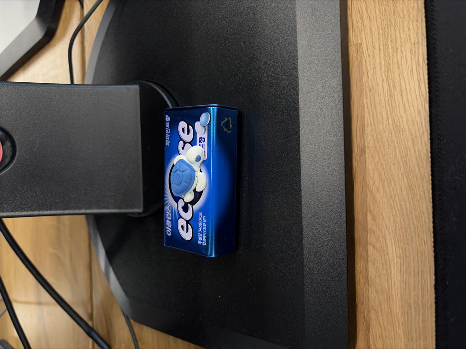 An indoor, eye-level shot captures a blue rectangular box of "Eclipse" brand mints centered on a black, textured surface, likely a monitor stand base. Korean text on the mint box reads "이클립스" (Eclipse), "페퍼민트향" (Peppermint scent), and "무설탕 34g (80kcal)" (Sugar-free 34g (80kcal)). A small, white figurine with a blue turtle shell is positioned on top of the mint box. Behind the stand base, a dark vertical monitor or speaker post is visible. Tangled black cables are present in the upper left. The black surface rests on a light brown wooden tabletop or desk, with a narrow strip of a black mousepad visible at the bottom. No people, actions, or interactions are observed. The specific location within Sofia, Bulgaria, cannot be identified from the visual evidence.