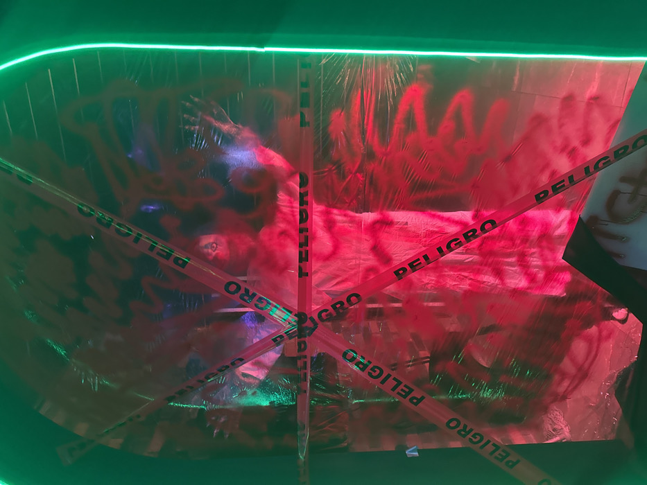 A surreal scene presents a figure trapped behind a plastic barrier. The plastic is marked with red, ominous markings and crisscrossed with hazard tape reading "PELIGRO." A vibrant green light frames the top of the enclosure, adding to the eerie atmosphere. The figure appears to be reaching out, contributing to the sense of confinement and danger. The overall impression is one of a staged, unsettling spectacle.