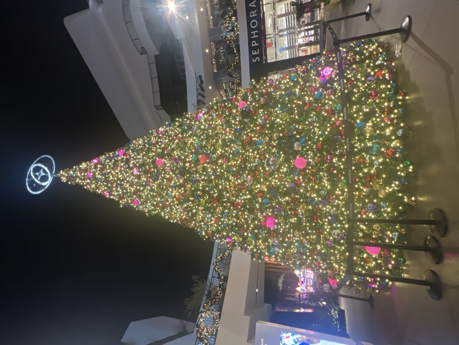 - "A large Christmas tree adorned with colorful ornaments and twinkling lights dominates the scene, set in front of a Sephora store" by FM-s3x7z2, licensed under CC BY 4.0
