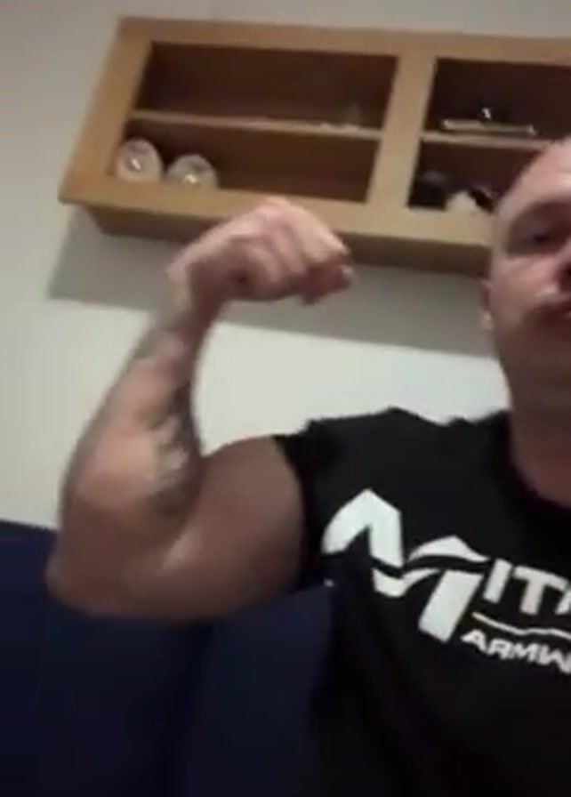- "A bald man with a mustache is sitting on a dark blue couch and shows off his flexed right bicep" by FM-qvTDD3, licensed under CC BY 4.0