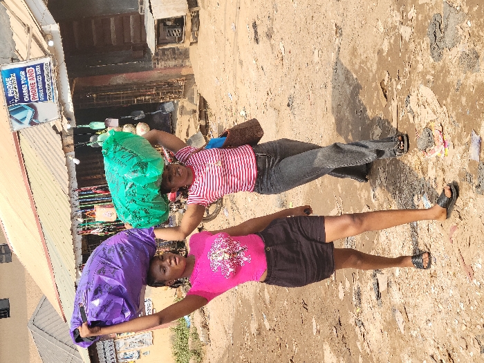 Two young females are depicted walking on an unpaved street in Awka, Nigeria, during daylight hours. The female on the left wears a pink t-shirt and dark shorts, carrying a large purple plastic bag balanced on her head, stabilized by her raised arms. She wears black slide sandals. The female on the right wears a red and white striped t-shirt and dark wide-leg jeans, similarly carrying a large green plastic bag on her head, also stabilized by her raised arms. She carries a patterned brown bag over her left shoulder and wears dark open-toe sandals. The ground consists of compacted dirt with scattered debris and small patches of mud. In the background, a single-story building with a corrugated metal roof is visible, featuring a sign that reads, "PHONE YOUR PHONE & CHARGE TOUR PHONE AND OTHER PHONES HERE," indicating a phone service establishment. Various merchandise hangs from the building's facade.