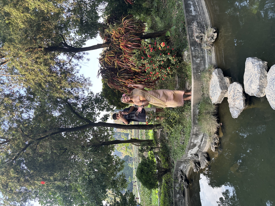 The image displays two individuals in a landscaped outdoor environment within Hoa Lư Ward, Vietnam. In the foreground, a dark-surfaced pond features three visible large, flat, grey stepping stones partially submerged in the water, leading away from the viewer. The pond edge is defined by a low concrete barrier with sparse vegetation. In the midground, a female subject stands barefoot on a grassy patch adjacent to the concrete edge, facing the viewer. She is attired in a traditional gold-colored garment draped over her body, covering one shoulder. Her light-colored hair is adorned with a flower on the right side. She exhibits a smile and holds both hands raised with palms open in a gestural pose. Behind her and slightly to the left, a male subject stands, wearing a dark t-shirt with a grey pattern and light-colored shorts. He holds a black smartphone horizontally with both hands, pointing it towards the female subject, in the act of recording or photographing. Lush green foliage from several trees and shrubs, including red-leafed plants and bushes with red flowers, frames the subjects. The background reveals an expansive open field, likely agricultural, containing scattered smaller trees and distant hills under a clear, bright sky. A tall, dark, multi-faceted structure, possibly a monument or statue, is discernible in the far-left background. The scene is illuminated by natural daylight.